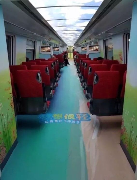 機場商務(wù)車廂抬頭就能看到藍天白云,低頭就是藍色星辰海。